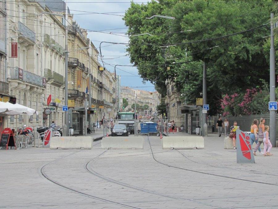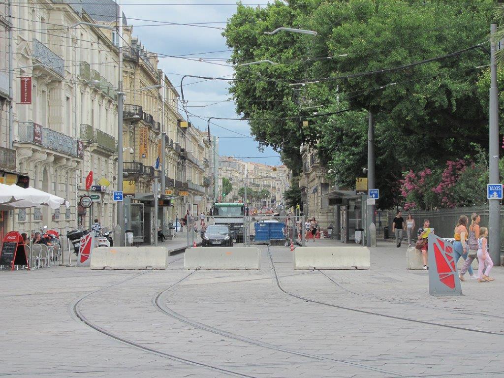 Aperçu de la place Auguste-Gibert à Montpellier, côté rue de la République, après les travaux de rénovation de la voie ferrée et la reconstituion du revêtement de la plateforme du tramway. Photo prise le samedi 27 juillet 2019. Copyright : Edouard Paris