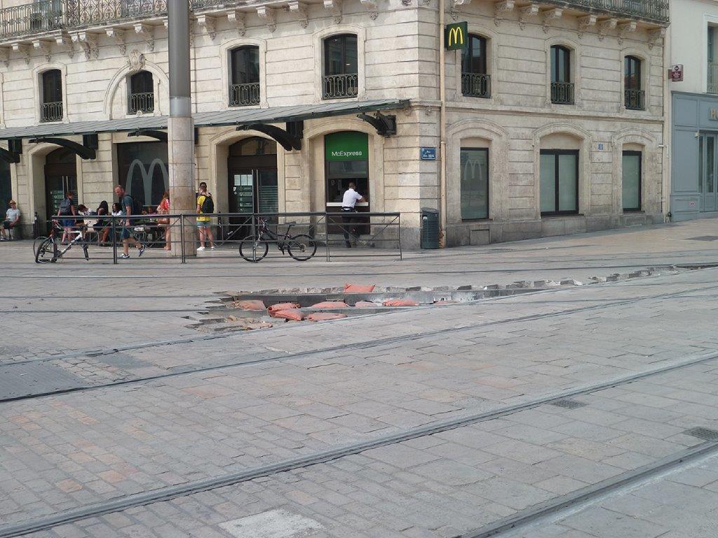Aperçu d’un autre chantier de rénovation de la voie ferrée dont les travaux de finition tardent à être réalisés, place Auguste-Gibert à Montpellier. Photo prise le mardi 27 août 2019. Copyright : Edouard Paris