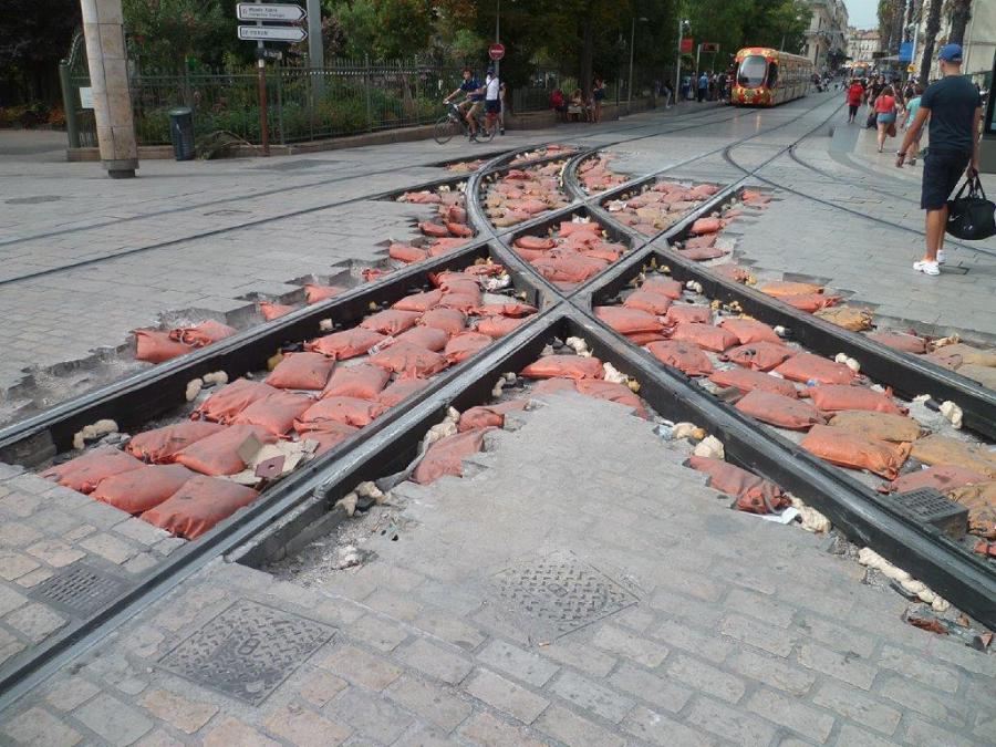 Aperçu du chantier de rénovation de la voie ferrée dont les travaux de finition tardent à être réalisés, place Auguste-Gibert à Montpellier, côté rue Maguelone. Photo prise le mardi 27 août 2019. Copyright : Edouard Paris