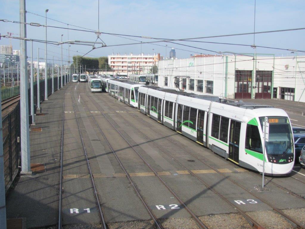 Vue sur le faisceau du centre d’exploitation et de maintenance Semitan-Dalby à Nantes où on peut distinguer des rames Urbos 3 CAF immobilisées, dont la 393 au premier plan, le lundi 26 août 2019. Copyright : Edouard Paris