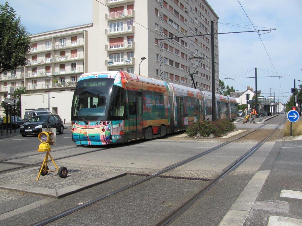 A Nantes, la rame 371 Incentro ADtranz à la livrée « Palinospia », circulant sur la ligne 3 en direction du terminus sud-ouest « Neustrie », est photographiée à son passage sur le rond-point de Vannes, le lundi 26 août 2019. Copyright : Edouard Paris