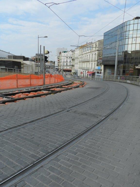 Dans le haut de la rue Jules-Ferry à Montpellier, à la jonction avec le Pont-de-Lattes, les travaux de finition de la rénovation de la voie ferrée n’étaient toujours pas terminés le dimanche 1er septembre 2019. Copyright : Anje34