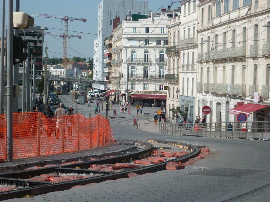 Haut de la rue Jules-Ferry à Montpellier où des travaux de finition de la rénovation de la voie ferrée étaient toujours en attente, le jeudi 29 août 2019. Copyright : Edouard Paris