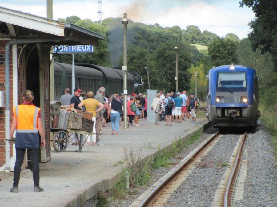 Avant de repartir directement vers Paimpol à 16h45, le train touristique La Vapeur du Trieux laisse passer en gare de Pontrieux un TER Breizhgo Paimpol – Guingamp assuré par l’autorail X 73583, le dimanche 25 août 2019 à 16h35. Copyright : Edouard Paris