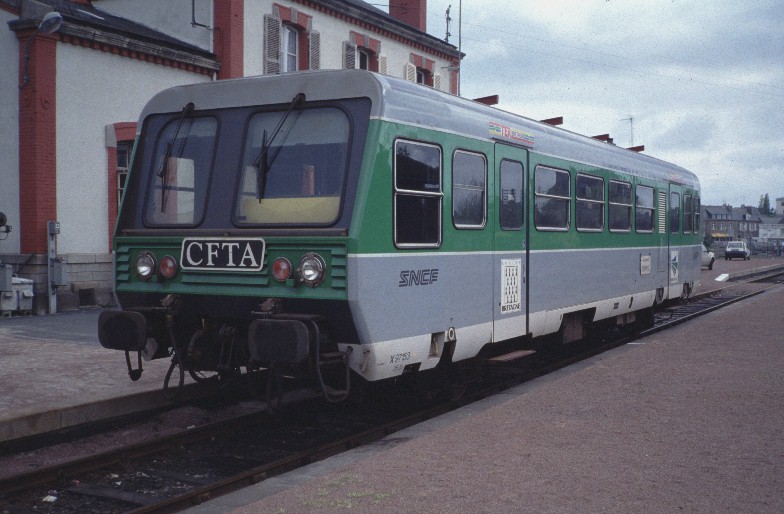 Photographie prise en gare de Paimpol, le mardi 8 mai 1991, d’un des trois autorails de la série A2E, ici le X 97153, ayant circulé entre mai 1990 et fin juin 2013 sur les lignes Guingamp – Paimpol et Guingamp Carhaix toutes deux exploitées par la CFTA. Copyright : Edouard Paris