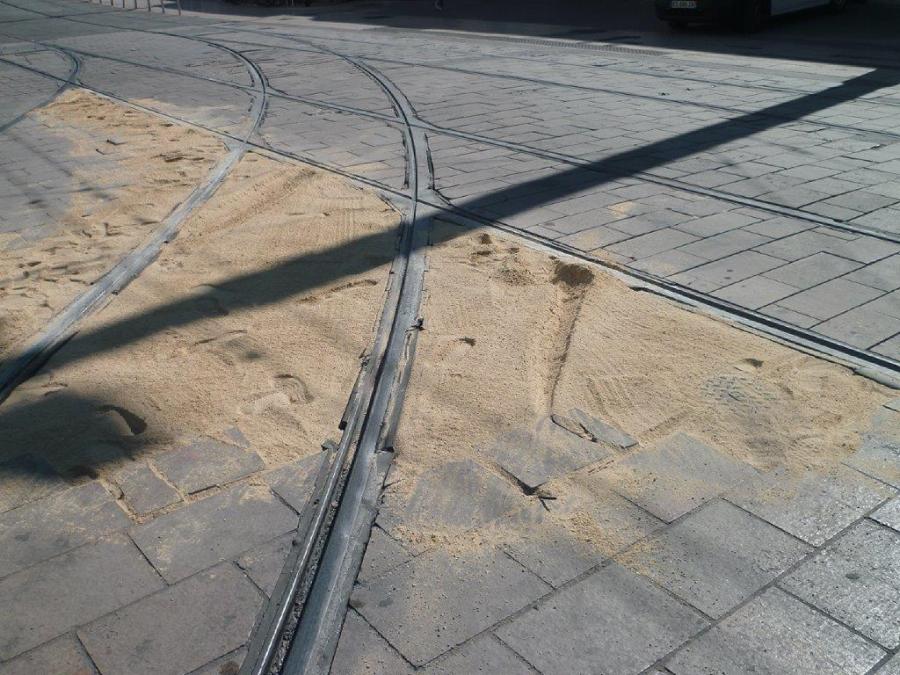 Place Auguste-Gibert à Montpellier, légèrement sur la droite, une ornière laissée par une roue avant d’une trottinette qui s’est enfoncée dans le sable à gros grains meuble avant de heurter le rail. Photo prise le mardi 3 septembre 2019 à 11h06. Copyright : Edouard Paris