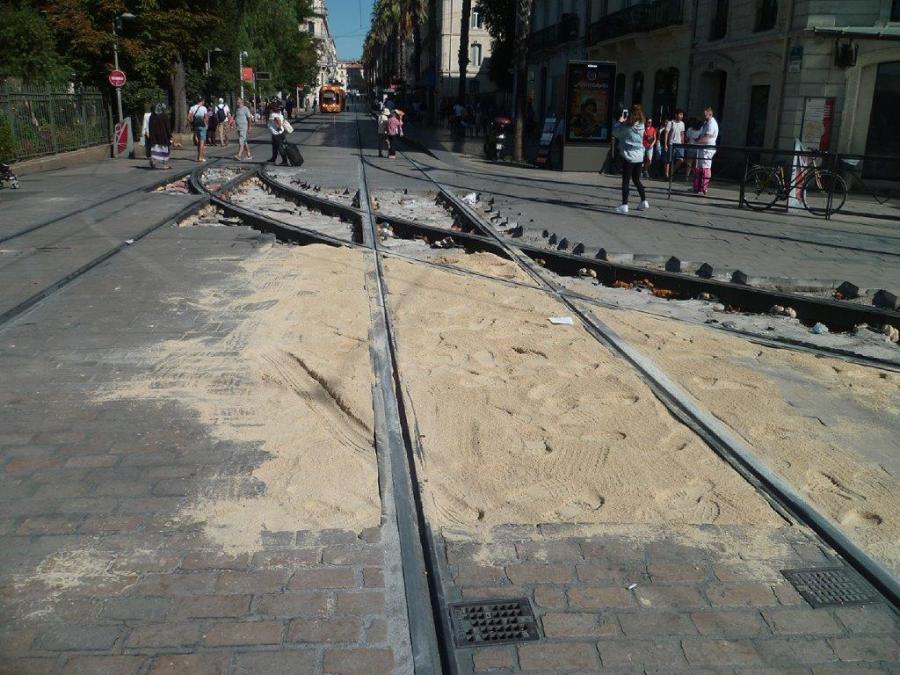 Place Auguste-Gibert à Montpellier, côté rue Maguelone, du sable à gros grains en guise de revêtement provisoire de la plateforme du tramway. Photo prise le mardi 3 septembre 2019. Copyright : Edouard Paris