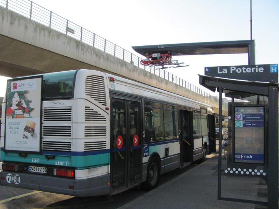A Rennes, le terminus « La Poterie » de la ligne 12 de bus urbains est doté d’une potence équipée d’un pantographe qui se déplie pour recharger partiellement les batteries des bus 100 % électriques Bluebus Bolloré. Photo prise le vendredi 4 janvier 2019. Le bus au premier plan n’est pas concerné par le dispositif précité. Copyright : Edouard Paris