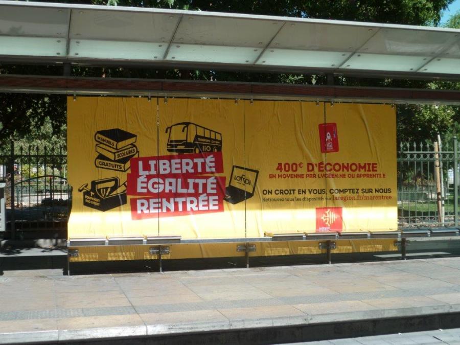 « Liberté, Egalité, Rentrée ». On pourrait croire aux maîtres mots des gilets jaunes en ce samedi 7 septembre 2019. Photo prise à la station « Gare Saint-Roch » commune aux lignes 3 et 4, le même jour. Copyright : Edouard Paris