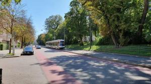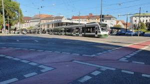 - A Augsburg, la rame 890 CF8 CityFlex Bombardier est photographiée sur Konrad-Adenauer-Allee, le mercredi 4 septembre 2019. Les bandes cyclables se distinguent pas leur couleur rouge. Copyright : Olivier Fleury