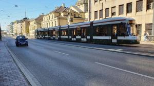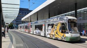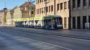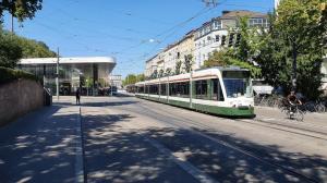 - A Augsburg, la rame 878 CF8 CityFlex Bombardier, opérant sur la ligne 1, est photographiée sur Karolinenstrasse, le mercredi 4 septembre 2019. Copyright : Olivier Fleury