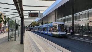 - A Augsburg, la rame 892 CF8 CityFlex Bombardier, opérant sur la ligne 2, est photographiée à la station « Königsplatz » côté Konrad-Adenauer-Allee, le mercredi 4 septembre 2019. Copyright : Olivier Fleury