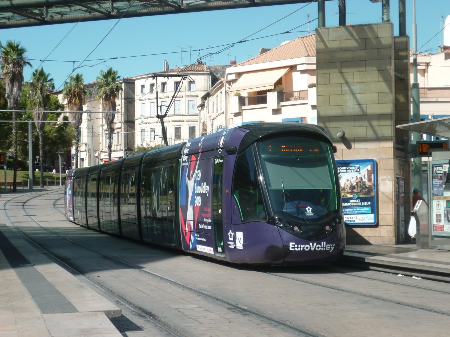 La rame 2098 Citadis 402 Alstom multiligne, opérant sur la ligne 1 et dont les motrices sont habillées aux couleurs de la CEV EuroVolley 2019 Masculins, est photographiée à la station « Corum », le jeudi 5 septembre 2019. Copyright : Edouard Paris