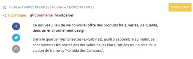 Capture d’écran des premières lignes de l’article intitulé « Montpellier : les Halles Plaza, une ouverture prometteuse » mis en ligne par le quotidien régional Midi Libre, le mercredi 11 septembre 2019