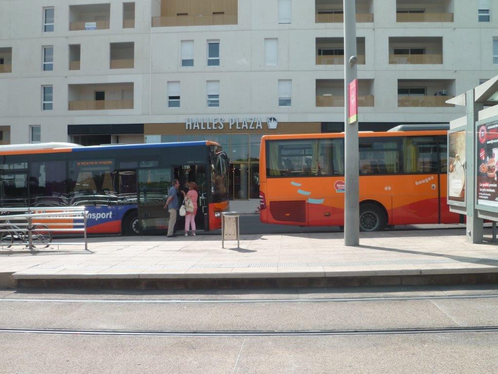 Rue de la Madeleine à Montpellier, aperçu entre deux autobus liO Hérault Transport de l’entrée des Halles Plaza face à la station « Sabines » de la ligne 2 de tramway. Photo prise le mercredi 18 septembre 2019. Copyright : Edouard Paris