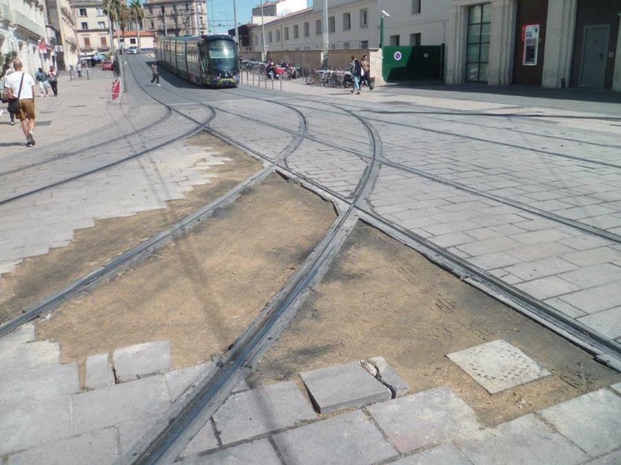Place Auguste-Gibert à Montpellier, côté Mc Donald, le sable à gros grains a été tassé par la pluie tombée la veille et par le passage de véhicules routiers. Photo prise le mercredi 11 septembre 2019. Copyright : Edouard Paris