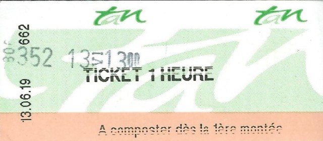 A Nantes, le ticket 1 heure papier est valable une heure pas plus à partir de sa validation qui doit impérativement s’effectuer dès la première montée à bord d’un bus, d’un tramway ou d’une navette fluviale. Même principe pour le ticket 1 heure papier détaché du carnet 10 trajets et pour le ticket papier navette aéroport. Pour les tickets 24 heures pas plus* il faut valider dès le premier voyage et vous n’aurez pas à le revalider à chaque montée, contrairement à ce qui se fait à Montpellier.