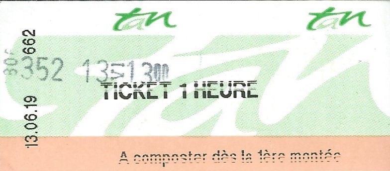 Ticket 1 heure Tan composté le jeudi 13 juin 2019 à 13h00. Fin de validité le même jour à 14h00. Même principe pour le mTicket 1 heure Tan et le M’Ticket TaM