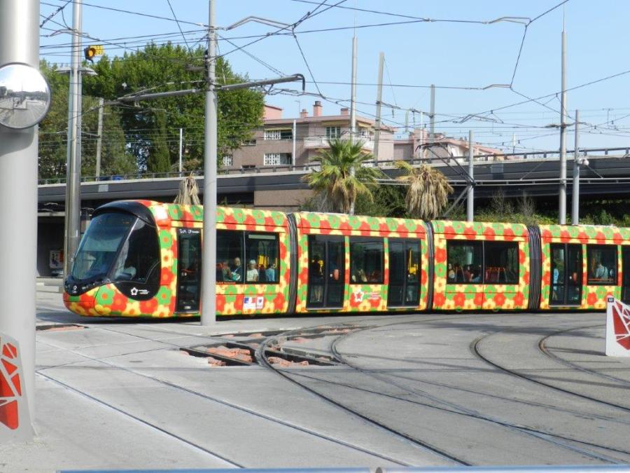 La rame 2094 Citadis 402 Alstom, opérant sur la ligne 2, est photographiée sur la place du 11 Novembre à Montpellier au moment où la motrice de tête passe à la hauteur d’un chantier de rénovation de la voie ferrée, le dimanche 15 septembre 2019. Copyright : Anje34