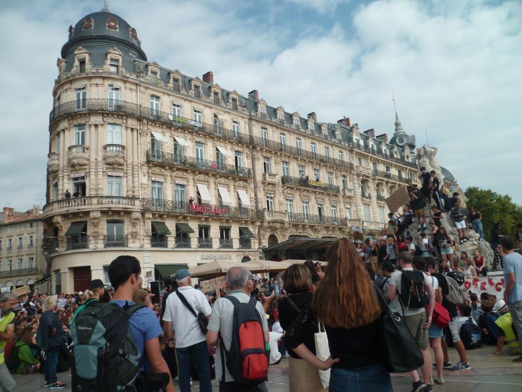 Place de la Comédie à Montpellier, le cortège de la marche pour le futur des jeunes Montpelliérain(e) marque une petite halte à 11h37, le vendredi 20 septembre 2019. Copyright : Edouard Paris