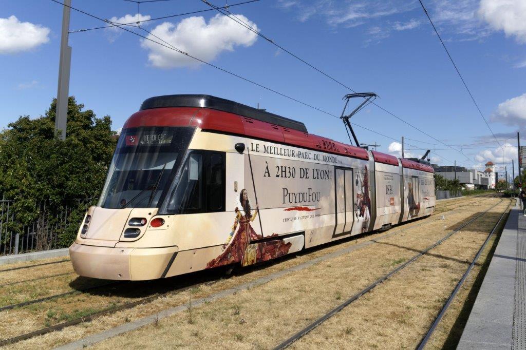 La rame Tango Stadler rhônexpress à la livrée « Puy du Fou », circulant en direction du terminus « Aéroport Lyon – Saint Exupéry », est photographiée trois secondes après son passage sans marquer d’arrêt à la station « Gare de Villeurbanne » de la ligne T3 du réseau de tramways lyonnais, le lundi 23 septembre 2019. Copyright : Yvon Brument