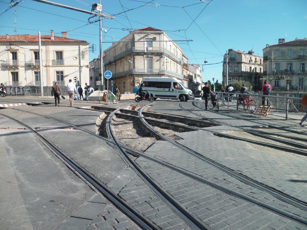 Les rails à vif sur le Pont-de-Lattes à Montpellier, à la bifurcation des lignes 1 et 3 de tramway. Photo prise le mardi 8 octobre 2019 après-midi. Copyright : Edouard Paris