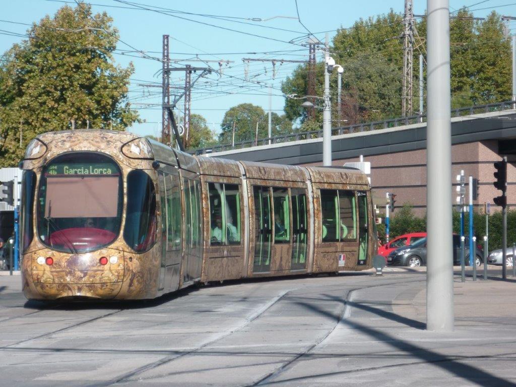 Les girouettes à pastilles des rames Citadis 401 Alstom et Citadis 302 Alstom vont progressivement disparaître du paysage montpelliérain. Photo de la rame 2042 Citadis 302 Alstom photographiée place du 11 Novembre 1918, le mardi 8 octobre 2019. Copyright : Edouard Paris