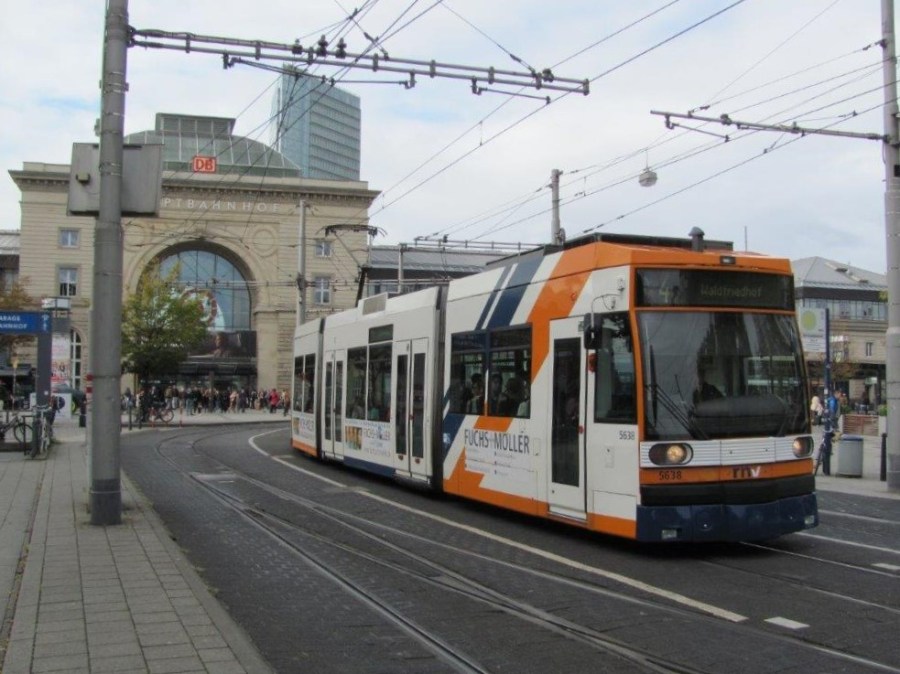 La rame 5638 RNVGT6N Duewag, opérant sur la ligne 4 en direction du terminus « Waldfriedhof », est photographiée au moment où elle quitte la station « Mannheim Hauptbahnhof », le samedi 28 septembre 2019. Copyright : Edouard Paris