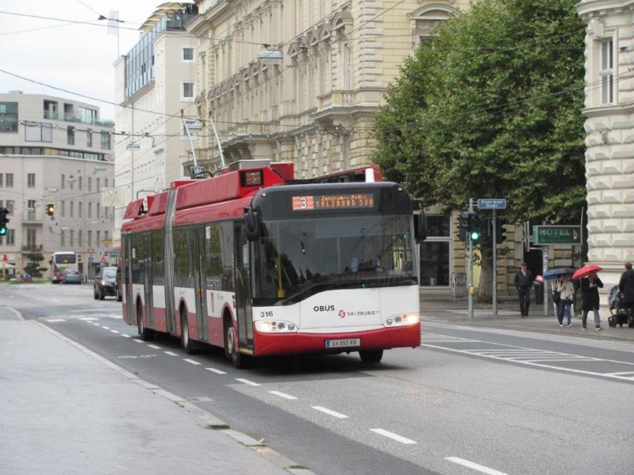 A Salzburg, le trolleybus 316 Trollino 18 Solaris, opérant sur la ligne 3, est photographié sur Rainerstrasse, le vendredi 4 octobre 2019. Ce trolleybus a circulé sur le défunt réseau de trolleybus de La Chaux-de-Fond en Suisse de 2005 à 2012 sous le numéro 141. Trois autres trolleybus du même type ont été rachetés au réseau TransN par le réseau de Salzburg. Copyright : Edouard Paris