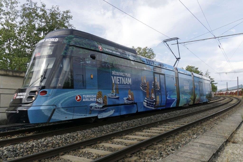 La rame 105 Tanglo Stadler rhônexpress pelliculée aux couleurs de destinations Turkish Airlines, circulant en direction de « Aéroport Lyon – Saint Exupéry », est photographiée non loin de la station « Décines Grand Large » de la ligne T3 où elle passera sans marquer l’arrêt, le samedi 12 octobre 2019. Copyright : Yvon Brument