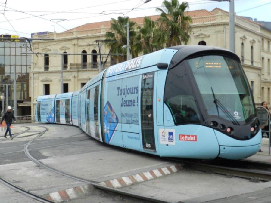 Passage de la rame 2098 Citadis 402 Alstom multiligne à la hauteur de la bifurcation des lignes 1 et 3 située sur le Pont-de-Lattes à Montpellier, le vendredi 11 octobre 2019. Copyright : Anje34