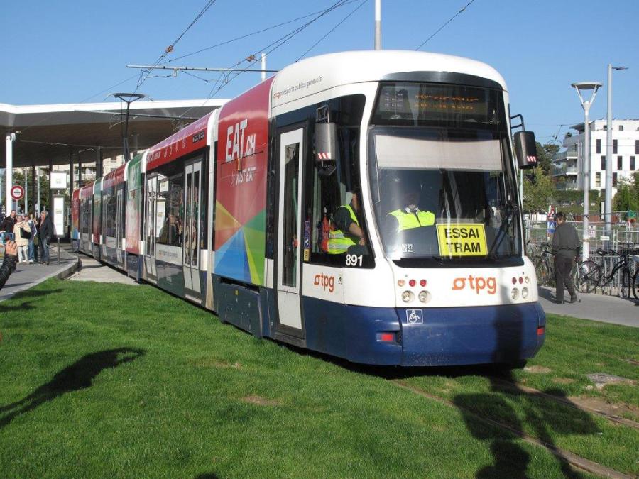 Premiers tours de roue en territoire français, à Moëllesulaz plus précisément, pour la rame 891 Cityrunner Bombardier des tpg, le lundi 14 octobre 2019. Une moitié de la rame se trouve encore à Moillesulaz, côté suisse. Copyright : bustramgeneve (JML)