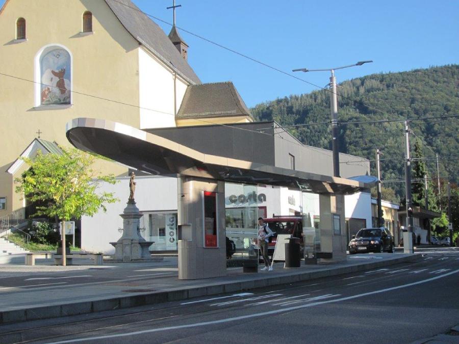 A Gmunden, photographie de la station à quai axial de la ligne 161 « Klosterplatz », le mardi 1er octobre 2019. Copyright : Edouard Paris