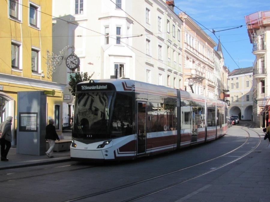 A Gmunden, la rame 130 Tramlink V3 Vossloh Kiepe, circulant en direction du terminus « Gmunden Bahnhof ÖBB », est photographiée à son arrivée à la station « Rathausplatz », le mardi 1er octobre 2019. Copyright : Edouard Paris