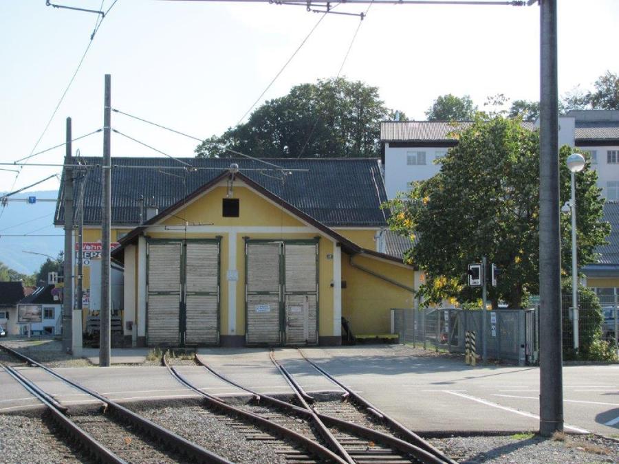 Remise où sont garées trois motrices historiques du tramway de Gmunden dans le haut de l’artère dénommée Alois-Kaltenbrunner-Strasse. Photo prise le mardi 1er octobre 2019. Copyright : Edouard Paris
