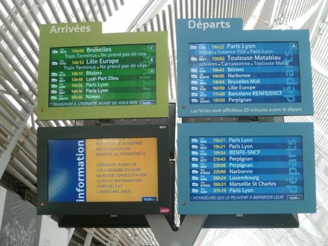 Ce samedi 19 octobre 2019, jour de grève inopiné à la SNCF, en gare de Montpellier Saint-Roch, il fallait deviner que les trains qui n’apparaissaient pas sur les écrans des départs et sur celui des arrivées ne circulaient pas. A 14h, la très grande majorité des TER, la totalité des Intercités et le Ouigo quotidien faisaient partie du lot des trains annulés et n’étaient donc pas affichés. Seul un TGV annonçé au départ était en réalité supprimé, en l’occurence le RENFE-SNCF Madrid – Marseille, départ 19h54 à destination de la cité phocéenne.