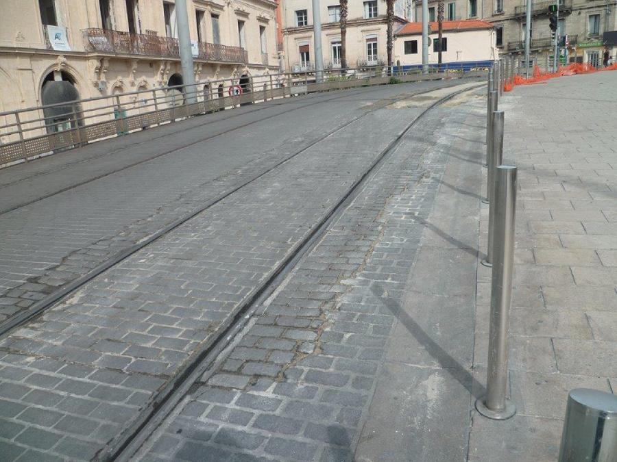 Dans le haut de la rue Jules-Ferry, de nouveaux pavés ont été posés sur une dizaine de mètres sur la plateforme du tramway côté voie 1 des lignes 1 et 3. Photo prise le vendredi 18 octobre 2019. Copyright : Edouard Paris