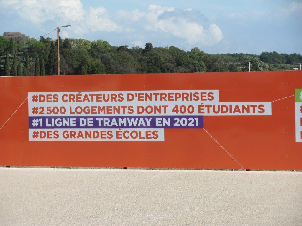 Contrairement à ce qui est indiqué sur le panneau, la desserte de la gare de Montpellier Sud de France par la ligne 1 de tramway n’est prévue qu’au mois d’août 2022. Photo prise le jeudi 24 octobre 2019. Copyright : Edouard Paris