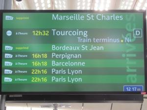 Ce jeudi 24 octobre 2019, en dépit de l’annonce de l’interruption de tout trafic ferroviaire entre Sète et Narbonne, en gare de Montpellier Sud de France l’écran des arrivées indiquait celle concernant le TGV de 16h18 composé d’une rame en provenance de Perpignan et d’une rame en provenance de Barcelone . Quant à l’écran des départs, il affichait un TGV à l’heure en soirée à destination de Béziers.