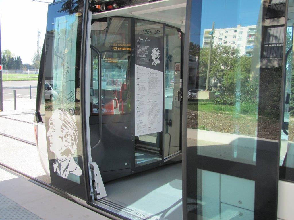 A Avignon, chaque rame Citadis 205 Alstom porte le nom et arbore le portrait stylisé d’une personnalité artistique ayant ou ayant eu un lien avec la ville. Leur carrière est retracée au dos de chaque cabine de conduite de la rame, comme ici la 109 baptisée Jean Vilar. Photo prise le samedi 26 octobre 2019. Copyright : Edouard Paris