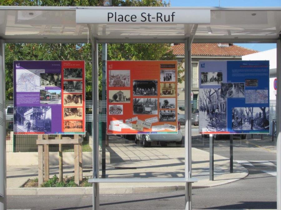 A Avignon, petite exposition photo sous un abri de la station « Place St Ruf » de la ligne T1, quai direction « St Chamand », immortalisée le samedi 26 octobre 2019. Copyright : Edouard Paris
