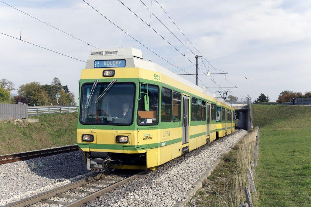La composition voiture-pilote 551 Bt et motrice 503 Be 4/4 (année 1981, constructeurs SWS/BBC), assurant une liaison Neuchâtel – Boudry, est photographiée à de la station « Areuse Littorail », le dimanche 27 octobre 2019. Copyright : Yvon Brument