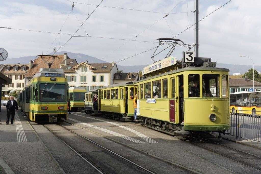 Au terminus « Boudry Littorail », la composition motrice 503 Be 4/4 et remorque pilote 551 Bt (année 1981 et constructeurs SWS/BBC) côtoie le tram touristique du Musée du Tram d’Areuse composée de la motrice 73 Be 2/2 TN (année 1922) de la remorque n°143 B2 et de la remorque n°1 (année 1898), le dimanche 27 octobre 2019. Copyright : Yvon Brument