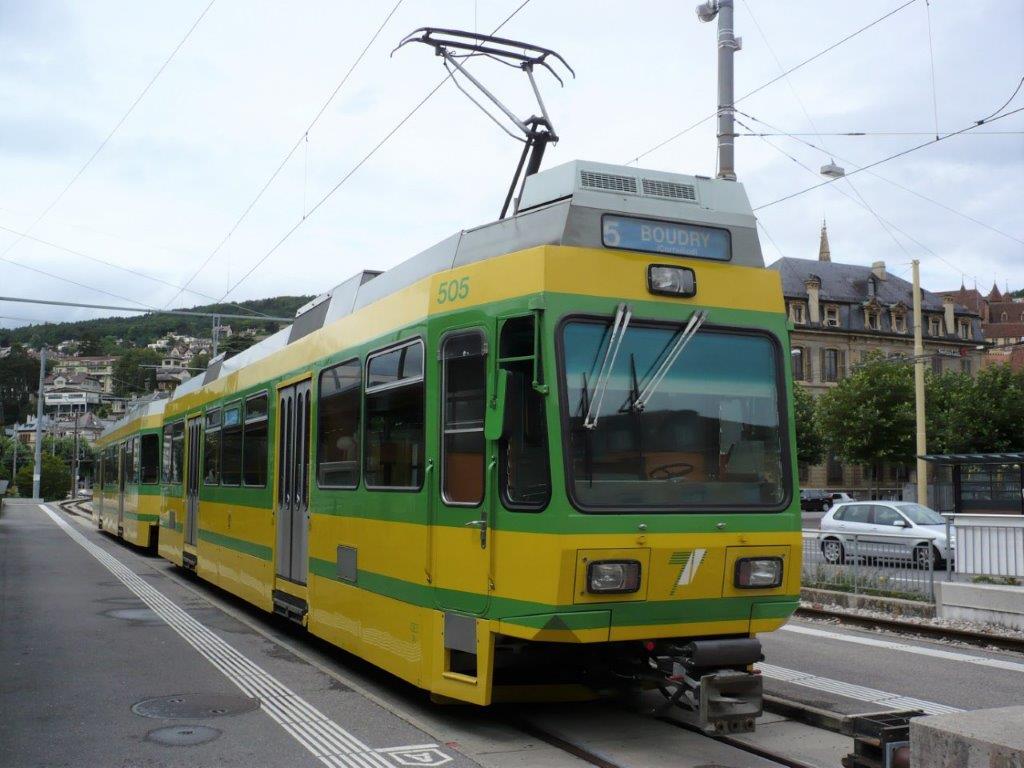 La composition motrice 505 Be 4/4 (année 1988, constructeur SWS/BBC) et voiture-pilote 551 Bt (année 1981, constructeurs SWS/BBC) est photographiée au terminus « Place Pury Littorail » à Neuchâtel, le lundi 20 août 2007. Copyright : Edouard Paris