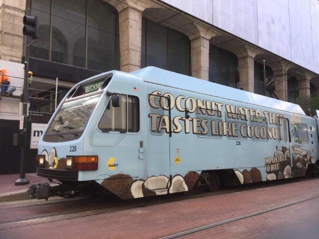 A Dallas, la motrice de la rame 228 triple caisse SLRV Kinki Sharyo à la livrée Coconut Water est photographiée à la station « Akard » commune aux quatre lignes de tramway au gabarit large du réseau DART, le mardi 1er octobre 2019. Copyright : Karine D