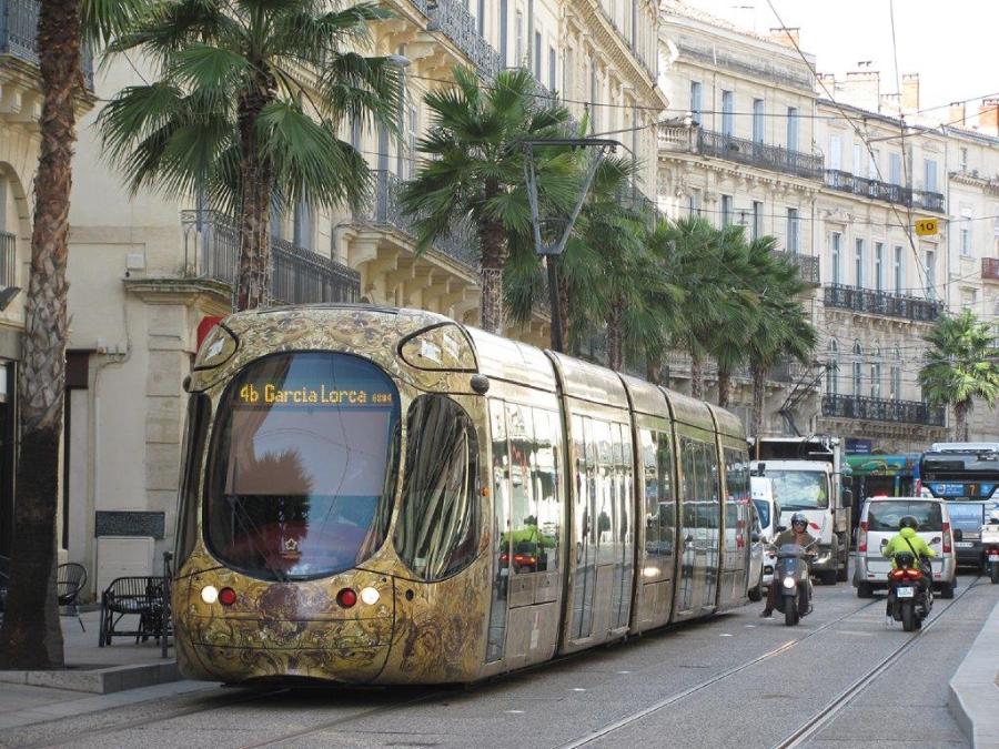 La rame 2031 Citadis 302 Alstom, dotée de girouettes à diode électroluminescente (LED), est photographiée sur le boulevard du Jeu-de-Paume à Montpellier, le mardi 5 novembre 2019. Copyright : Edouard Paris