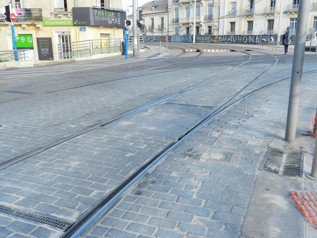 A Montpellier, les nouveaux pavés, qui habillent la plateforme du tramway commune aux lignes 1 et 3, ont enfin été posés à la jonction du haut de la rue Jules-Ferry et du Pont-de-Lattes. Photo prise le vendredi 8 novembre 2019. Copyright : Anje34
