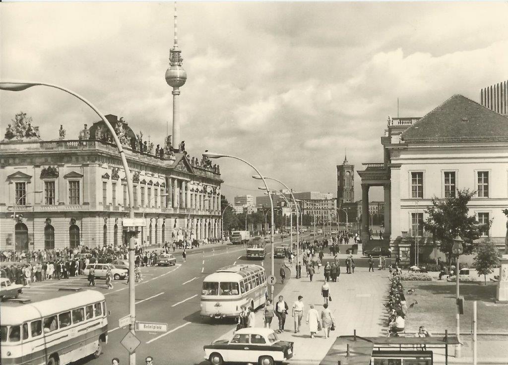 La photo montre la célèbre avenue Unter den Linden à Berlin capitale de la RDA, ainsi que le précise la légende écrite en langues allemande, anglaise, française et russe au recto de la carte postale éditée en 1973, vendue 25 pfennig est-allemands