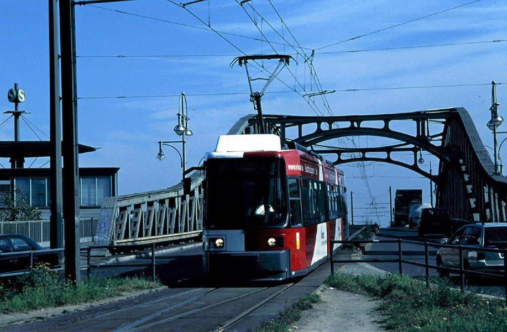 Dans la nuit du jeudi 9 au vendredi 10 novembre 1989, c’est principalement par le Bösebrücke que les Berlinoises et Berlinois de l’Est se sont précipité(e)s en masse vers le secteur Ouest de Berlin, mais il faudra attendre 1994 pour que les tramways puissent à nouveau circuler d’Est en Ouest et vice versa. Sur la photo, prise le samedi 22 septembre 2007, la rame 1020 GT6N AEG, opérant sur la ligne M13 en direction du terminus » Wedding – Virchow-Klinikum », vient de passer à l’Ouest en traversant le Bösebrücke sur la voie unique à double sens. Copyright : Edouard Paris