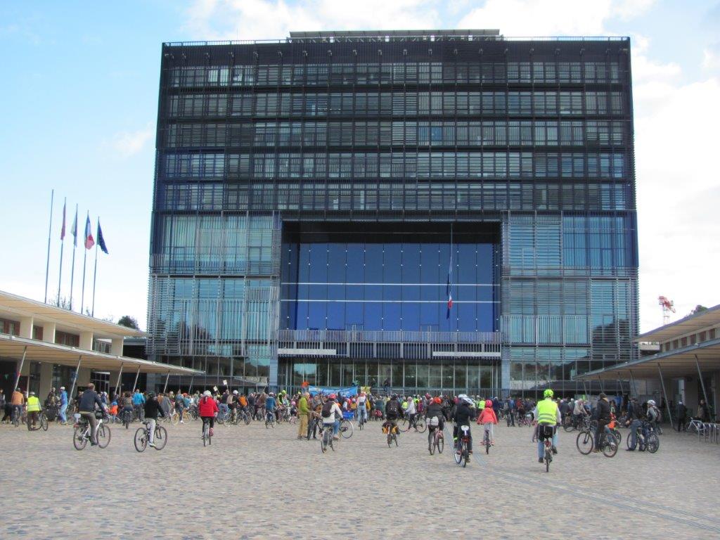 Les cyclistes mobilisés en nombre, dans le cadre de la journée « Tous à Vélo » affluent sur le parvis du Nouvel hôtel de ville de Montpellier, le dimanche 10 novembre 2019 à 15h36. Copyright : Edouard Paris